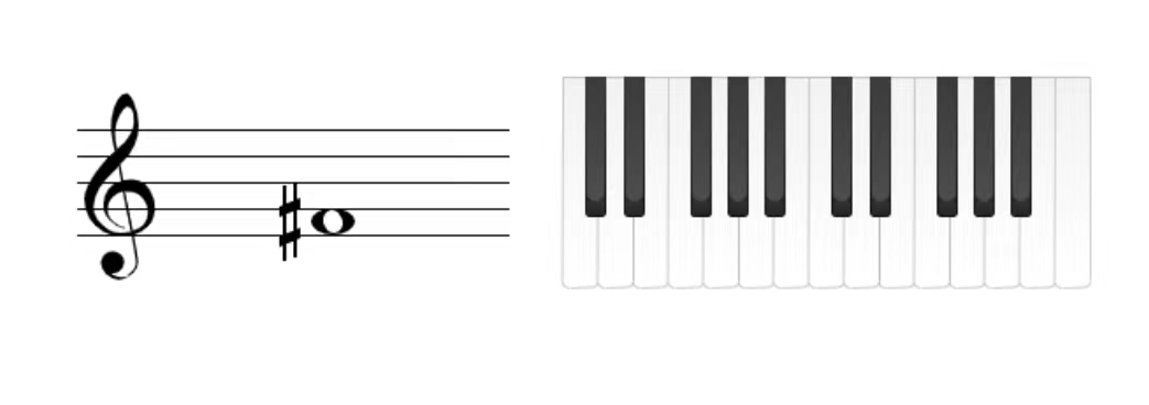 最后,比较钢琴键盘与五线谱上半音的数量,并添加升降号,C-Eb 是一个小三度音程。